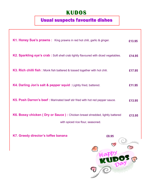 The Kudos Restaurant Menu presents a great selection of dishes, blending traditional favorites with innovative options. From fresh, seasonal ingredients to expertly crafted flavors, the dishes reflect a commitment to quality. The starters, such as the creamy tomato soup and vibrant beetroot salad, set the tone for what’s to come, highlighting the chef's attention to detail. For mains, the pan-seared duck breast with a rich berry sauce is particularly noteworthy, offering a balance of tender meat and flavorful tang. Vegetarians will appreciate the delicious grilled vegetable risotto, a hearty and satisfying choice that doesn’t compromise on taste.